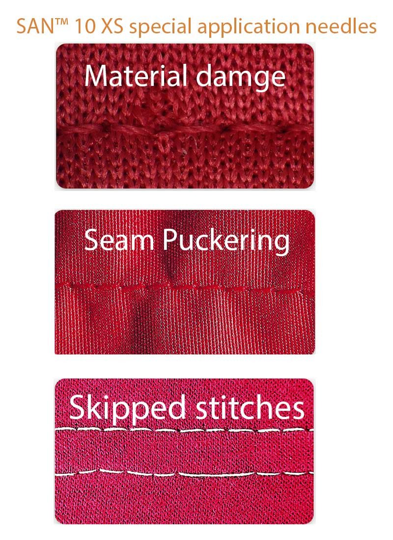 For the processing of ultra-fine fabrics and materials that are extremely difficult to sew, the newly-conceived SAN™ 10 XS offers an even higher level of material protection. The cylindrical blade enables a gentle penetration of the material by the needle, which reduces material damage. On the other hand, the extremely slim design of the SAN™ XS reduces its needle stability. For this reason, it is recommended to use the SAN™ 10 XS for applications where the main focus lies on the avoidance of material damage. Additionally, it is recommended to use the thinnest possible sewing thread.
